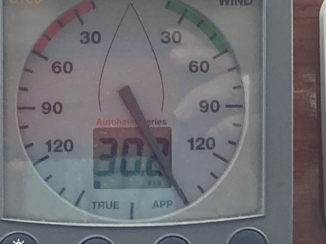 Which is what happened to Floriana during the early morning hours of October 23rd. The forecast predicted winds from the north at 15 to 20, gusting to 25. This type of forecast usually doesn’t alarm us as we prepare properly for it. However, the 15 to 20 materialized into 25 to 30, gusting to 40! We were NOT prepared. In the middle of the night, the gusts were reading 38 to 40 knots and we were up trying to understand the conditions around us. Our Rocna was holding well, but the stretch on the snubber line was a little alarming. After some evaluation, we decided that we would feel safer if we re-anchored in deeper water.