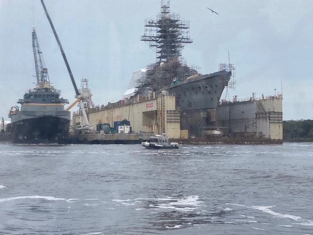 We made our way to the St. John’s River that leads up into Jacksonville. We decided to cross the river and keep going south instead of visiting Jacksonville. The St. John’s River is a commercial traffic area with the Atlantic Marine Dry Dock where military vessels are refitted. Here too, marine security patrols keep all vessels at least 50 yards from the dry dock.