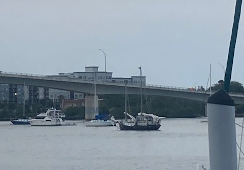 We anchored Floriana just south of the Seabreeze Twin Bridges. There weren’t many boats at the anchorage, but one did stand out. It didn’t catch our eye because it was black, or because it was steel, or because it was a Junk Rig….what caught our eye was the chicked pecking underneath the dodger! The name of the sailboat is Ondine. We took the dinghy over to Ondine and introduced ourselves. We met this very nice woman, single hander, named Nancy and she told us all about Penny…her liveaboard chicken!