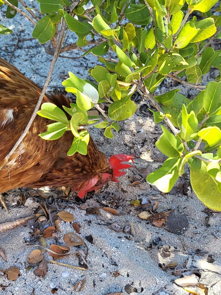 Nancy explained to us that Penny was raised from a chick onboard the boat and provided her with an egg per day. Nancy has taken Penny down the east coast and to Bahamas. She takes the chicken on the dinghy and lets her walk around onshore. Penny never tries to run away, and she has become a sailing companion to Nancy, and she appreciates having her aboard.