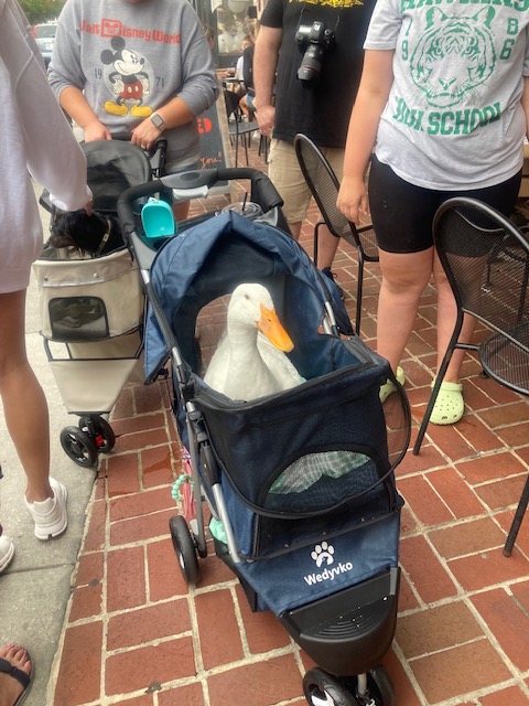 This goose was found on the side of the street one day, hit by a car and crippled. Her friend toof her to the veterinarian and got her help. She can no longer walk on one leg but the woman that found her keeps her at the house, keeps her healthy and well fed, and even takes her out for a stroll down Main Street every so often. To that woman, Thank you for being a friend to the animals!