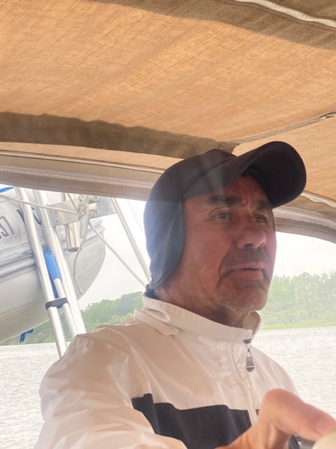 On our way to Beaufort, S. Carolina. It was an overcast day and a little cool. I guess Claudio was cold!