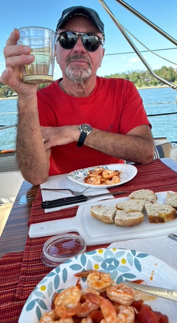 Sunday finally came and we FINALLY cast off from our dock. That day we stopped at Sore Thumb, just short of Fire Island Inlet, and enjoyed a quiet evening and our first dinner onboard the boat.