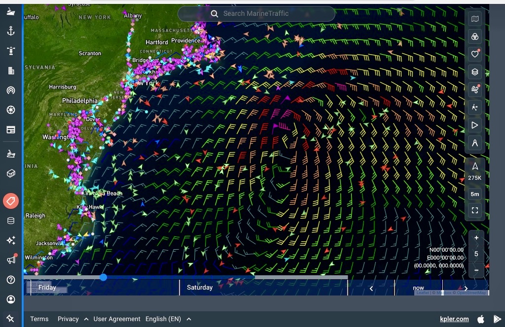 Apparently, there has been a large storm offshore churning the waters around us. The picture below, taken from our chart plotter, shows that winds at the center of the storm are as high as 45 knots….but the winds that affect us most at the outer bands are still clocking in at 30+ knots! The ride is VERY uncomfortable and ocean waves are 5′ to 6′ and very close to each other. Suffice it to say, I was NOT a happy camper!