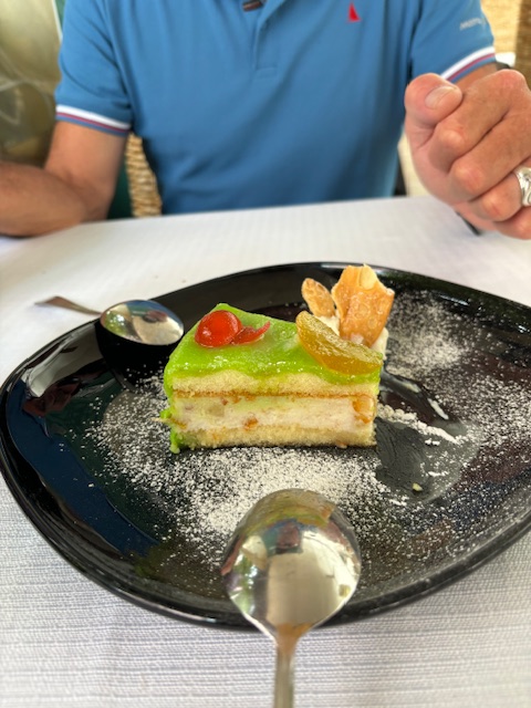 And then Claudio ordered a slice of Cassata Siciliana….a decadent dessert of Sicily with fragrances of almond and candied fruits tied together with a creamy ricotta filling……Flori is very happy.