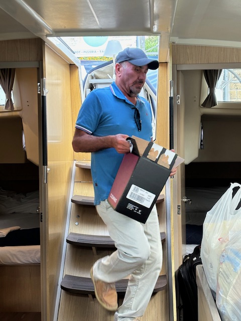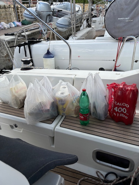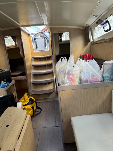 After being briefed on all the boat systems, charter rules and local maritime laws, we finally got our food delivery. There is a local supermarket on premises that is well furnished. Yesterday I shopped for all the things I think I’ll need for at least the first week of cruising, and they kept it for me overnight and refrigerated those things that needed to stay cold. Today, when we were ready, the marina office called them to deliver the groceries to the boat.