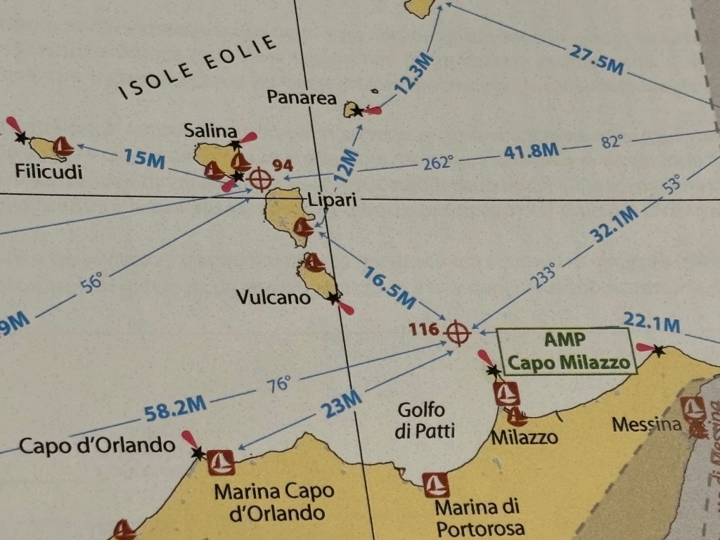 This is the itinerary that we chose, starting from the Maruna of Portorosa… first stop tomorrow, the island of Vulcano.